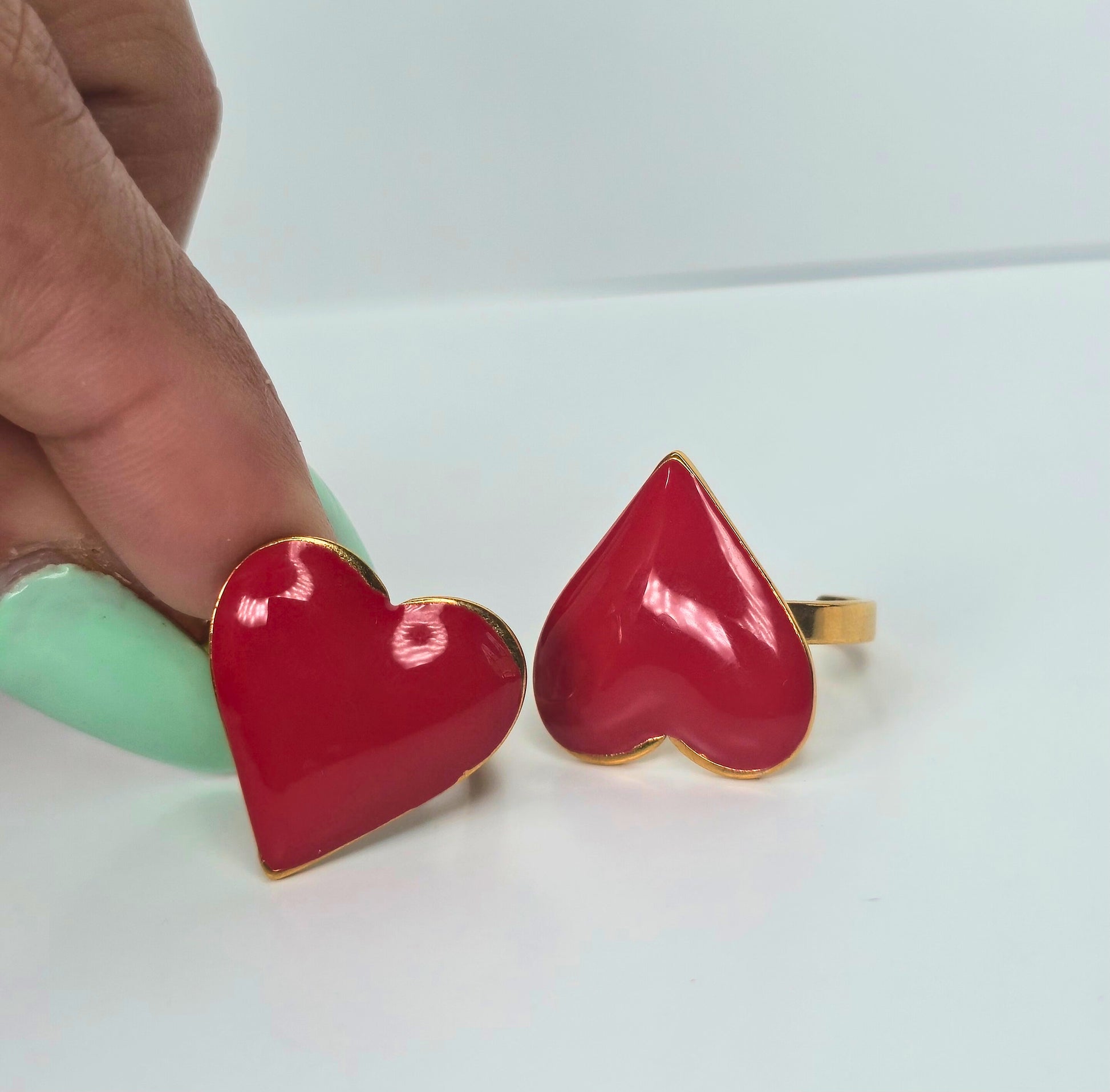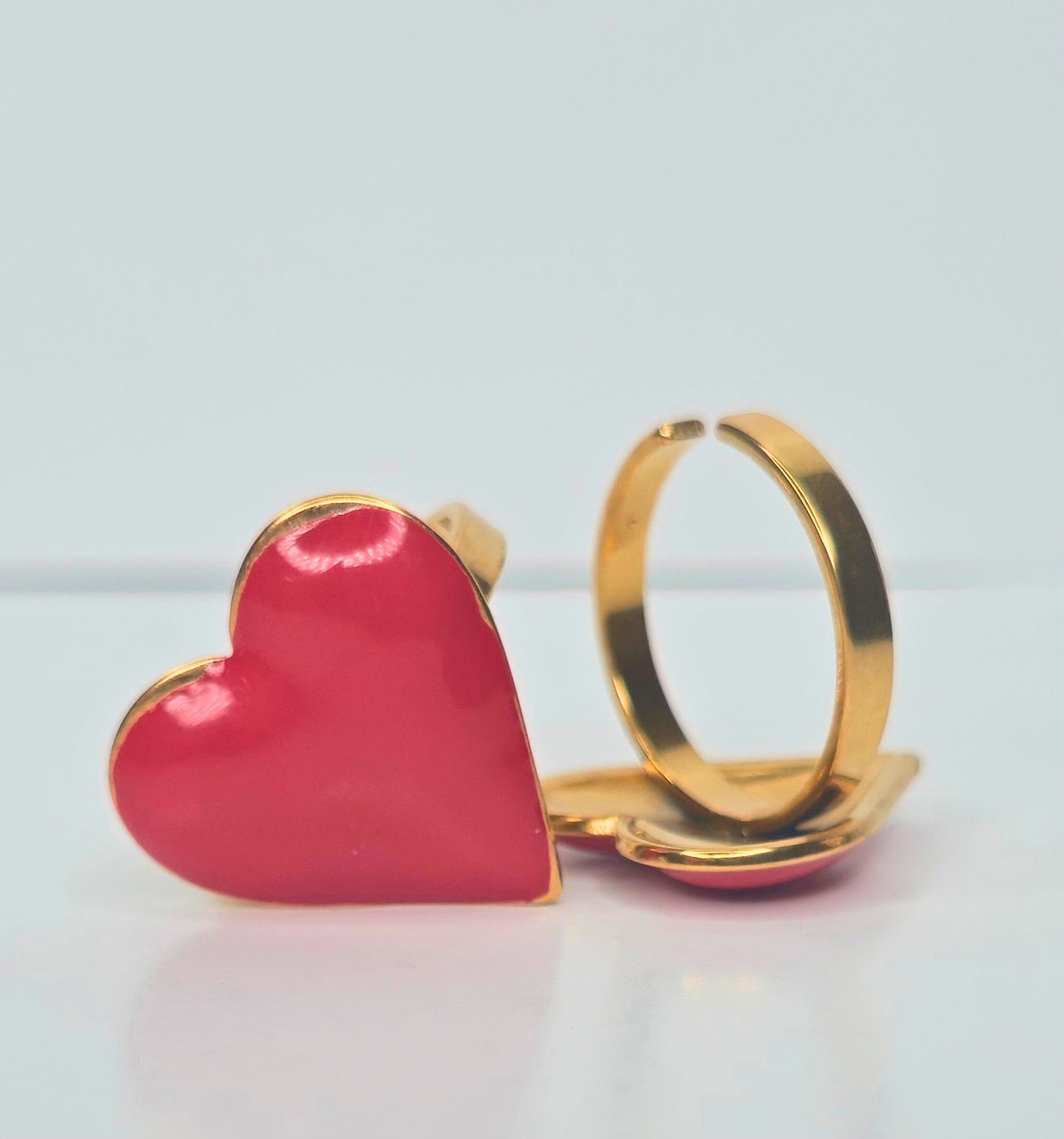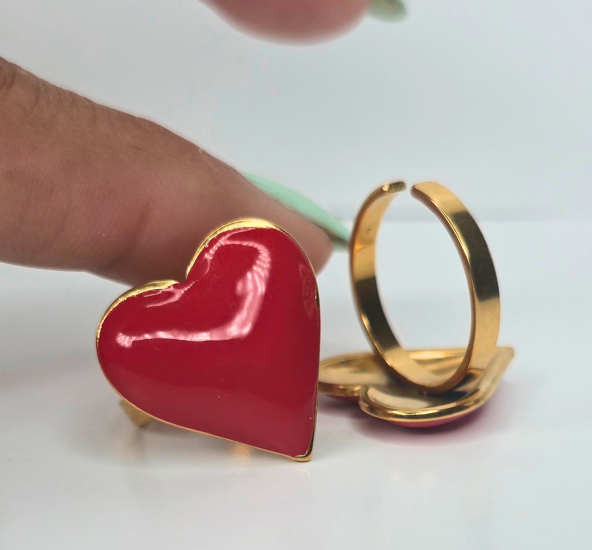 Stainless steel ring with 18K gold plating, featuring a delicate solid red heart for a modern and elegant style. Its adjustable design comfortably fits any size, making it a versatile piece perfect to enhance any look with a fashionable and sophisticated touch.