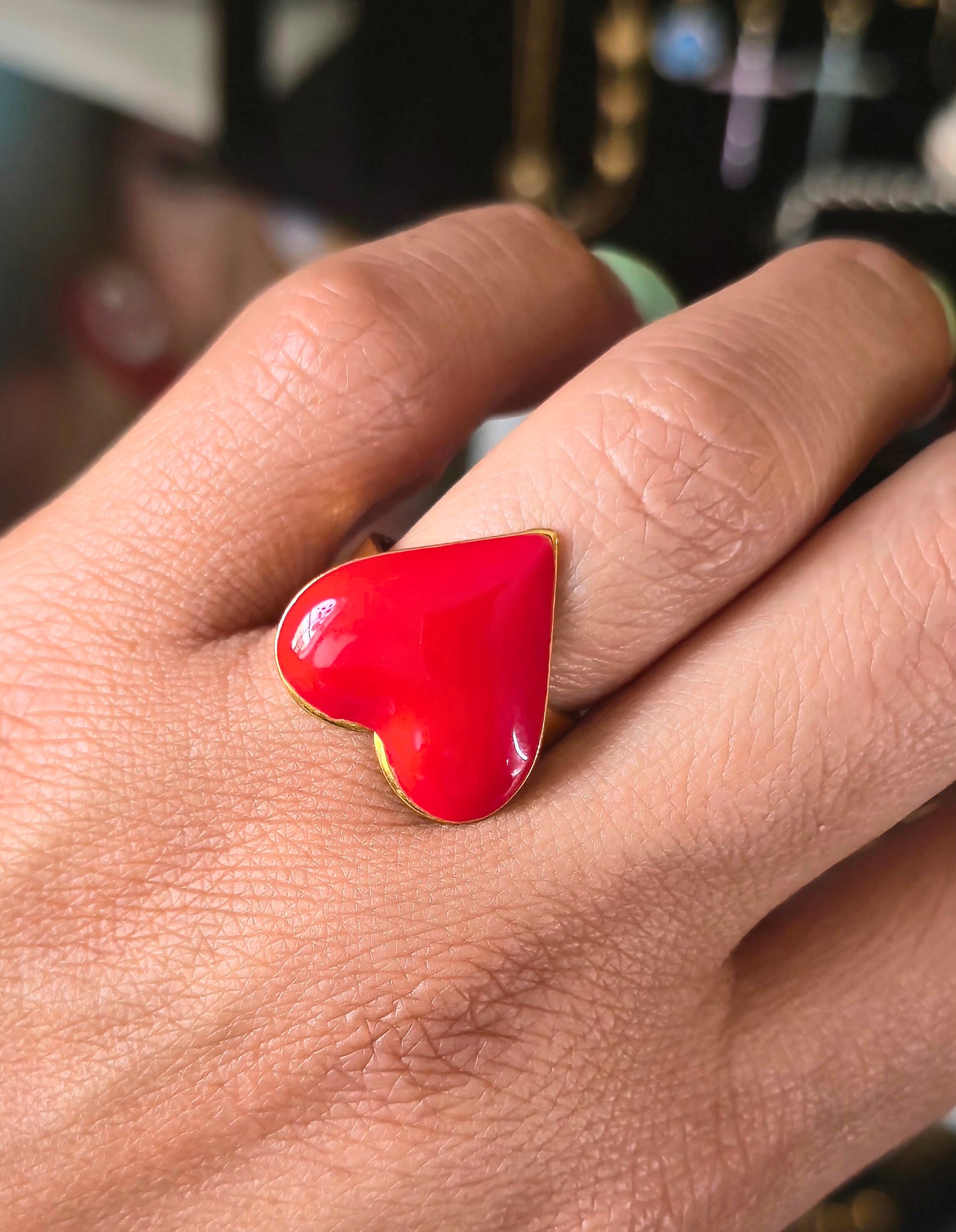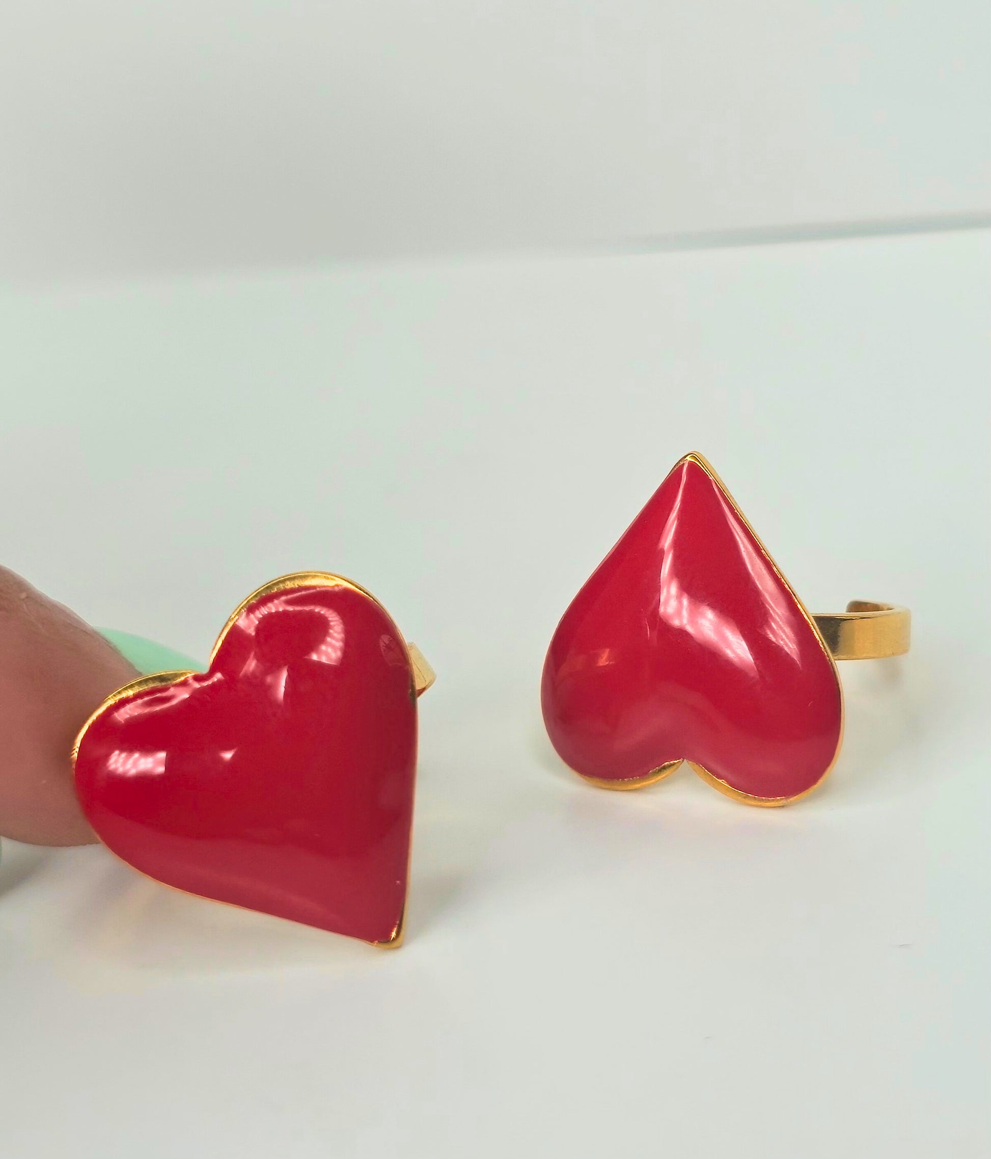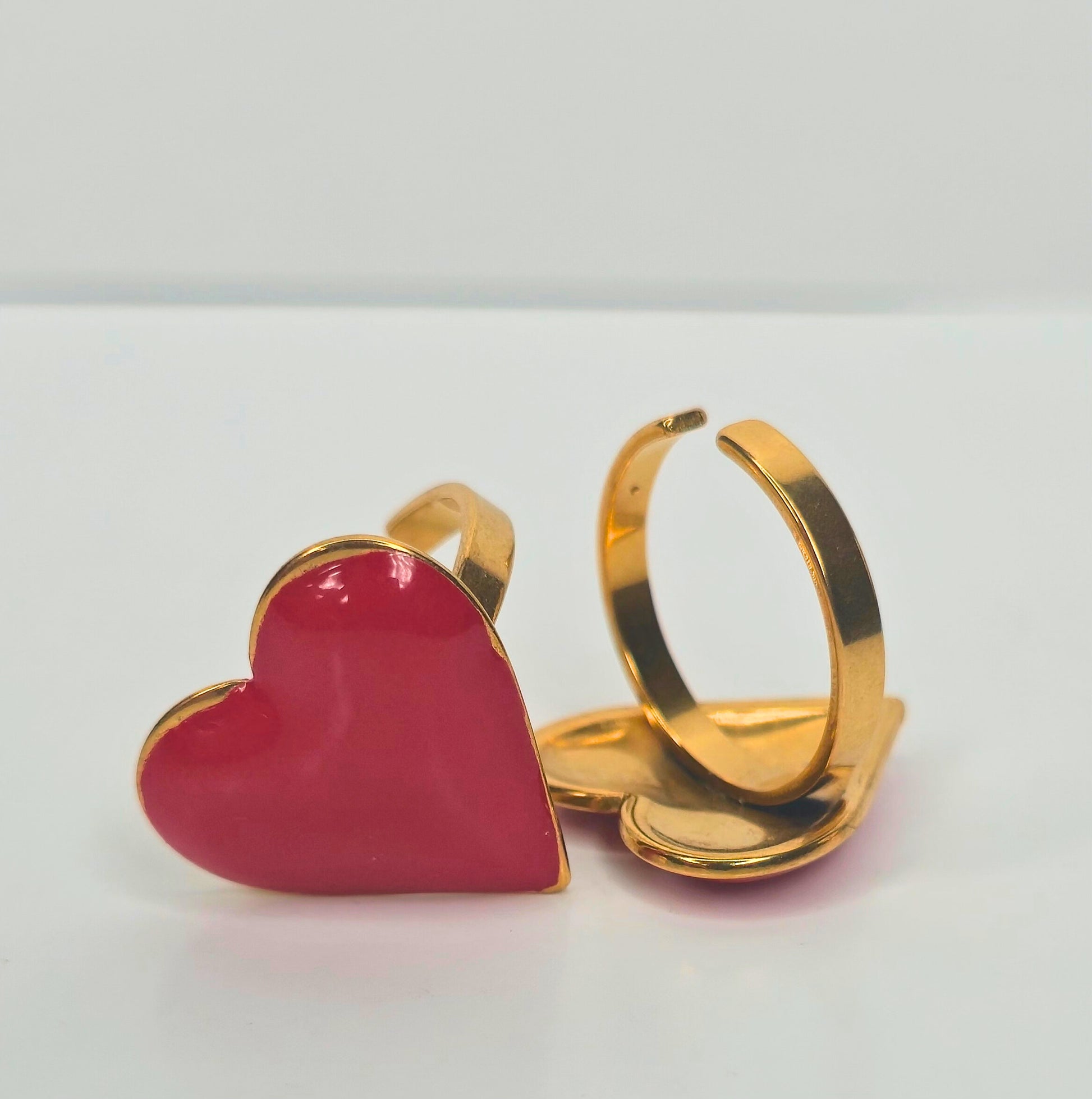 Stainless steel ring with 18K gold plating, featuring a delicate solid red heart for a modern and elegant style. Its adjustable design comfortably fits any size, making it a versatile piece perfect to enhance any look with a fashionable and sophisticated touch.