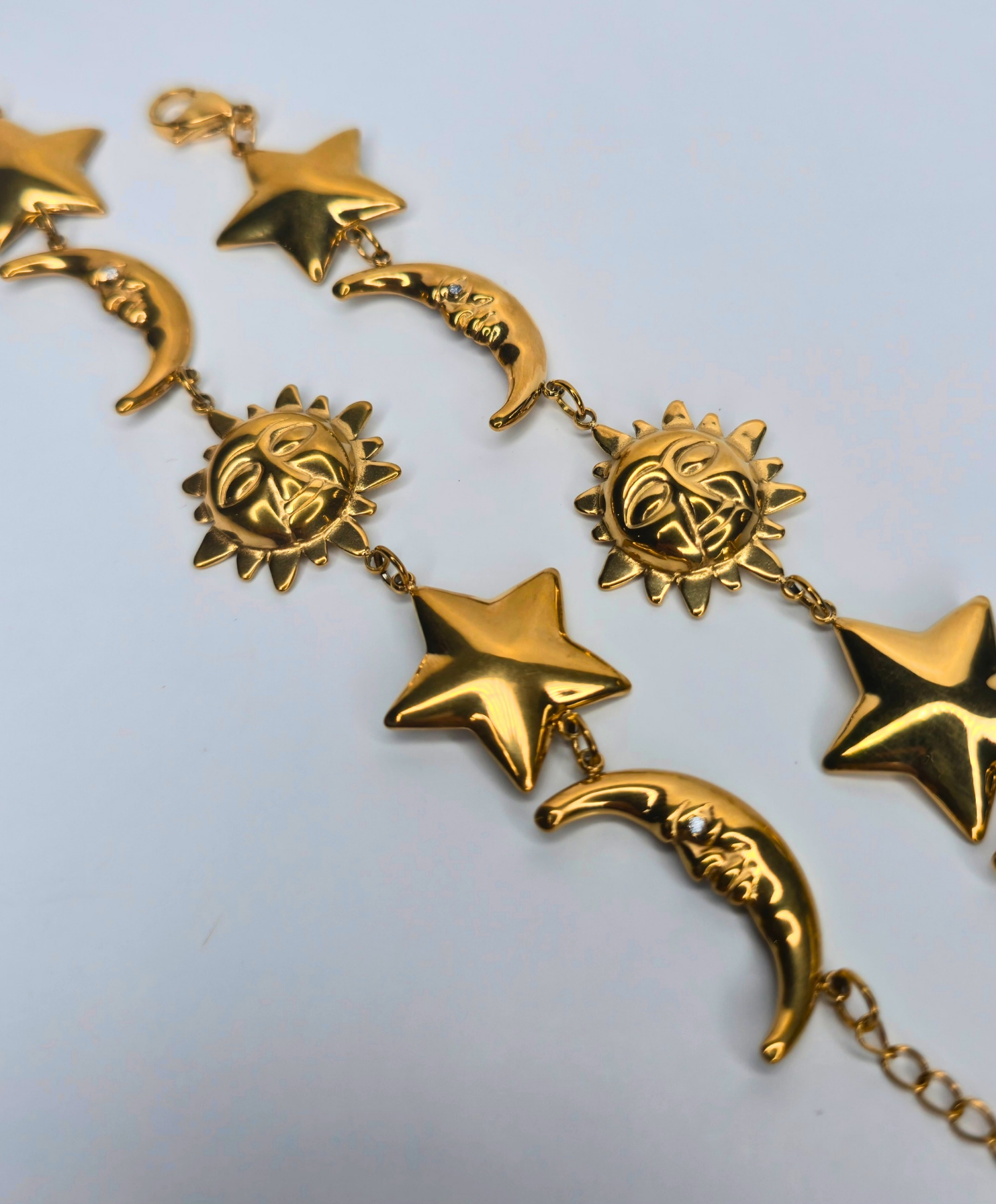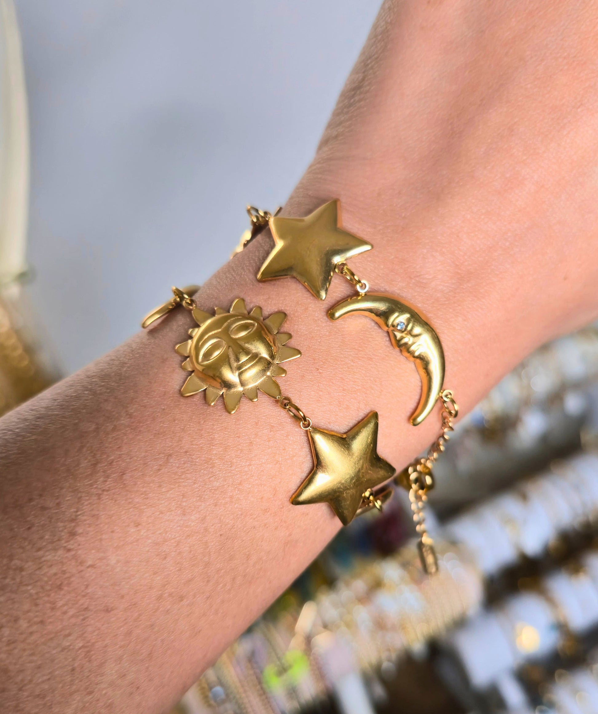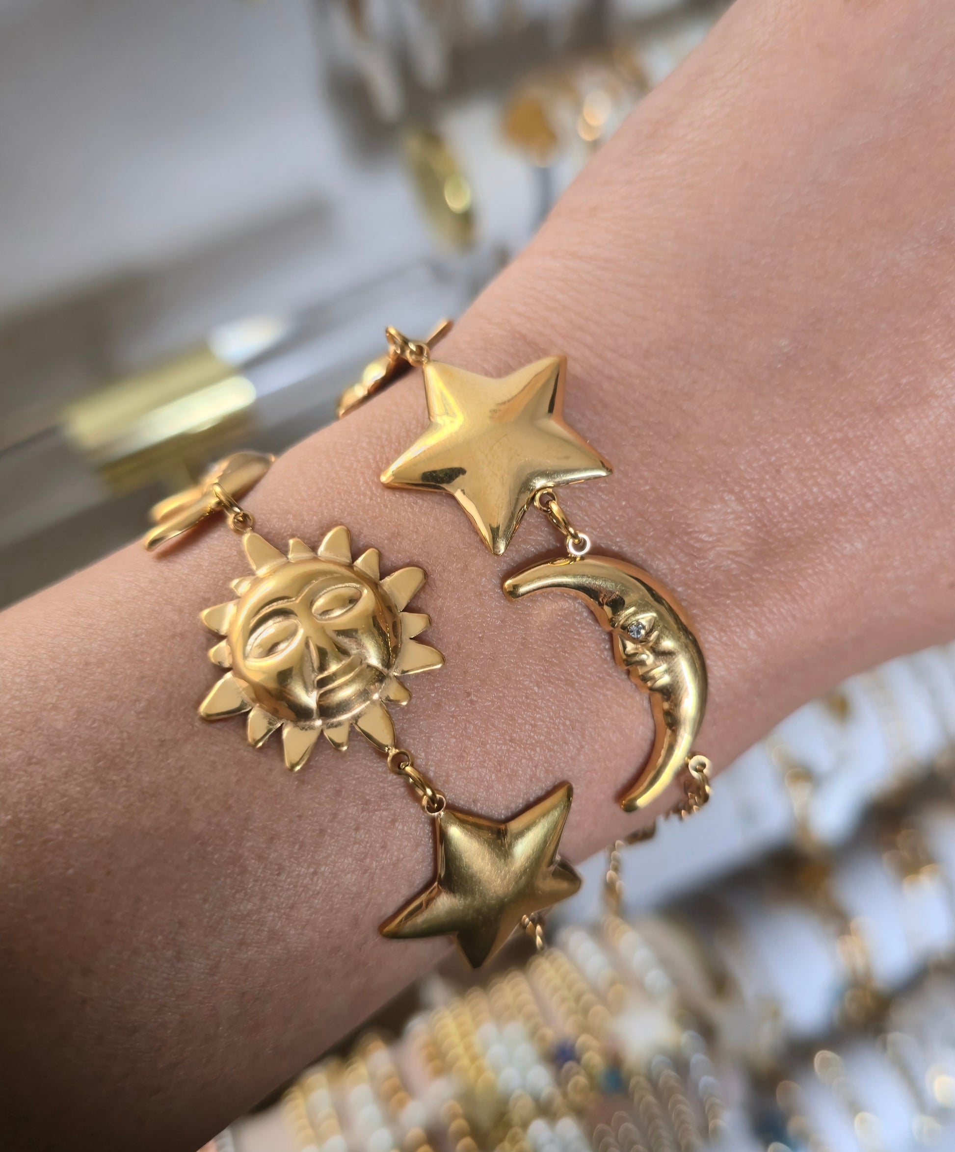 Golden bracelet with stars, moons, and constellations; a universe of style in every detail. made in stainless steel with 18K gold plating, water resistant.
